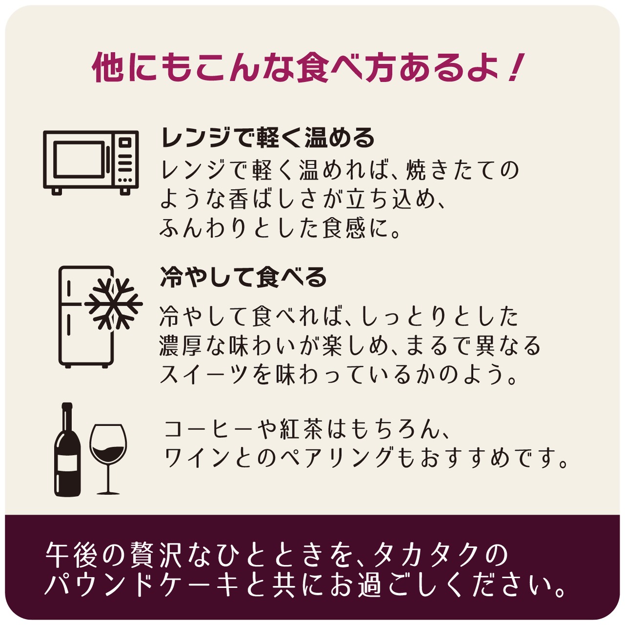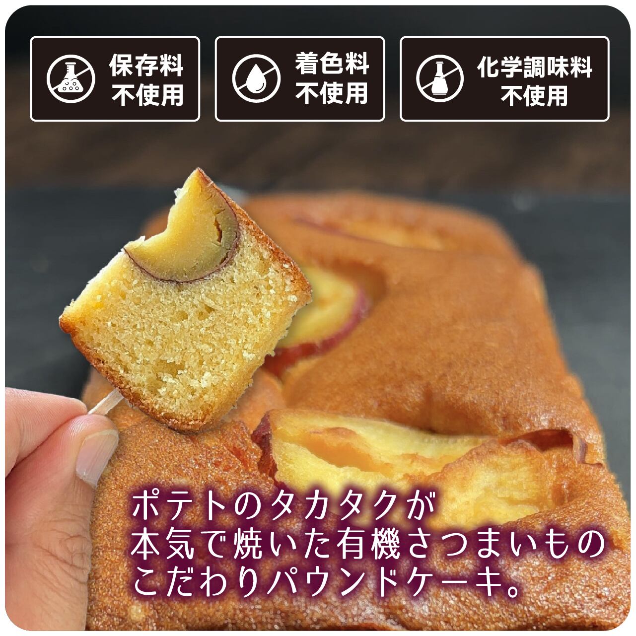 ポテト料理のプロであるタカタクが、大切な妻の笑顔のために、一切の妥協なく素材と製法にこだわり抜き、たどり着いた究極のパウンドケーキです。
