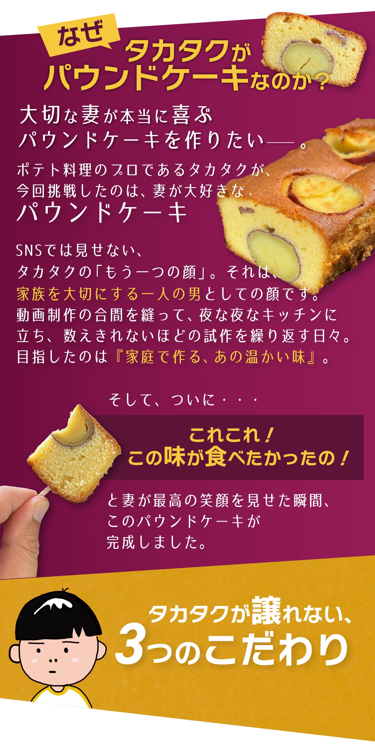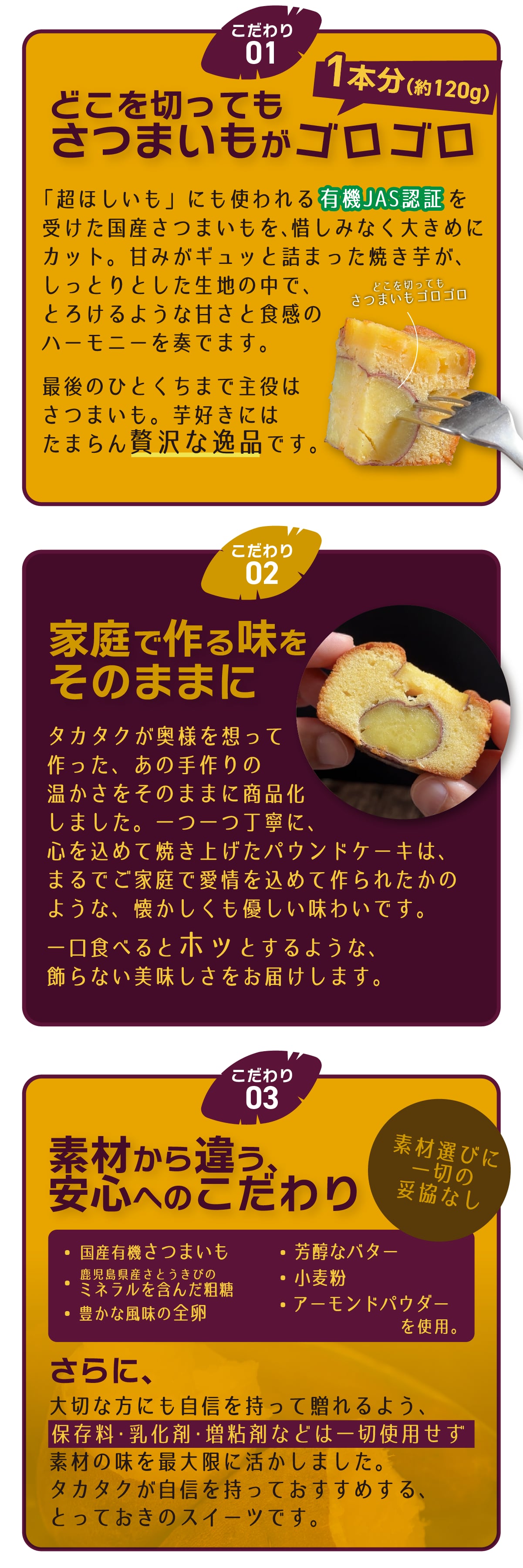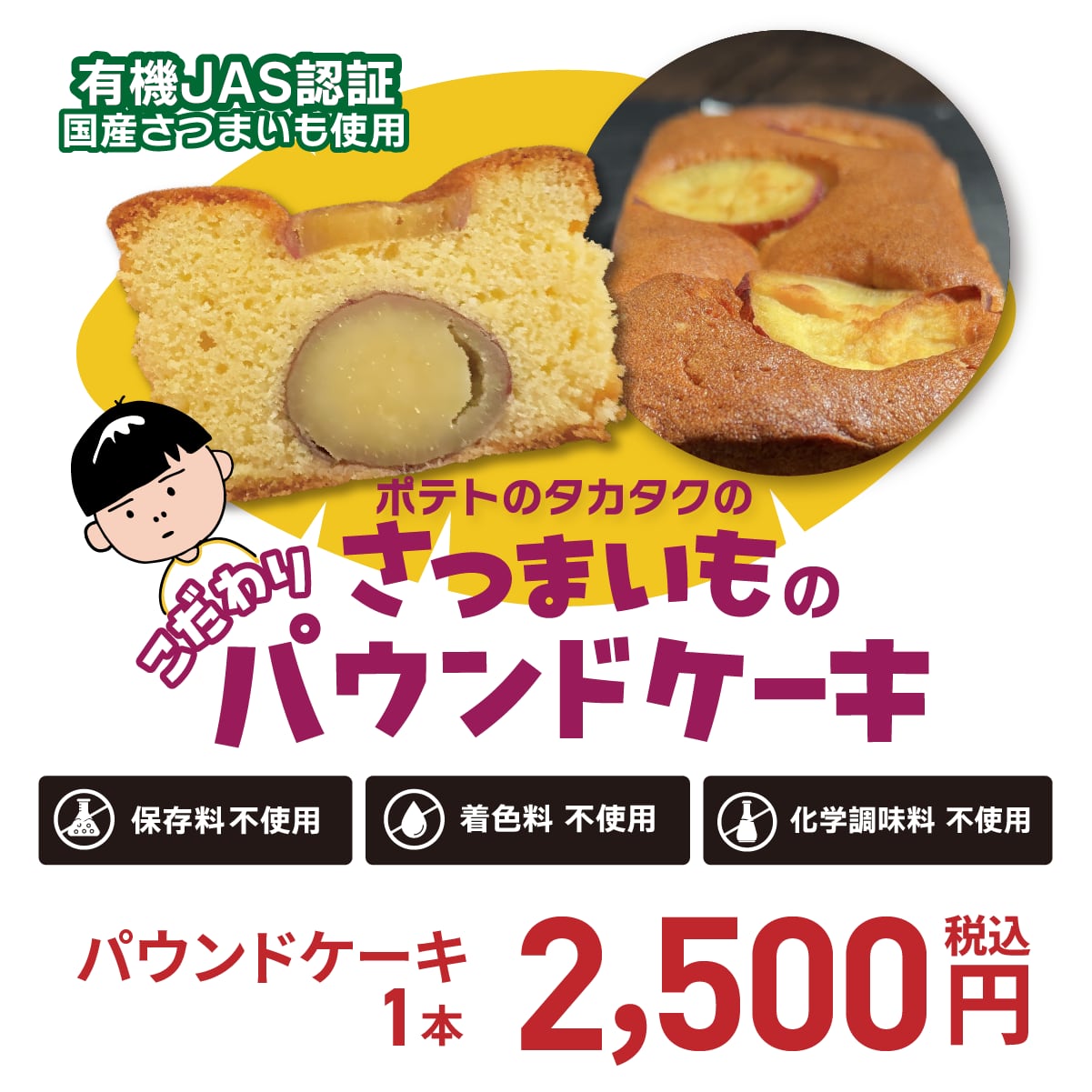 大ヒットした『超ほしいも』で使っている、あの有機JAS認証を受けた、とろけるような甘さの国産有機さつまいもを厳選。今回はそれを贅沢に大きめにゴロゴロとカットし、パウンドケーキに練り込みました。しっとりとした生地の中で、さつまいもの存在感を存分に感じていただける、新しい美味しさです。