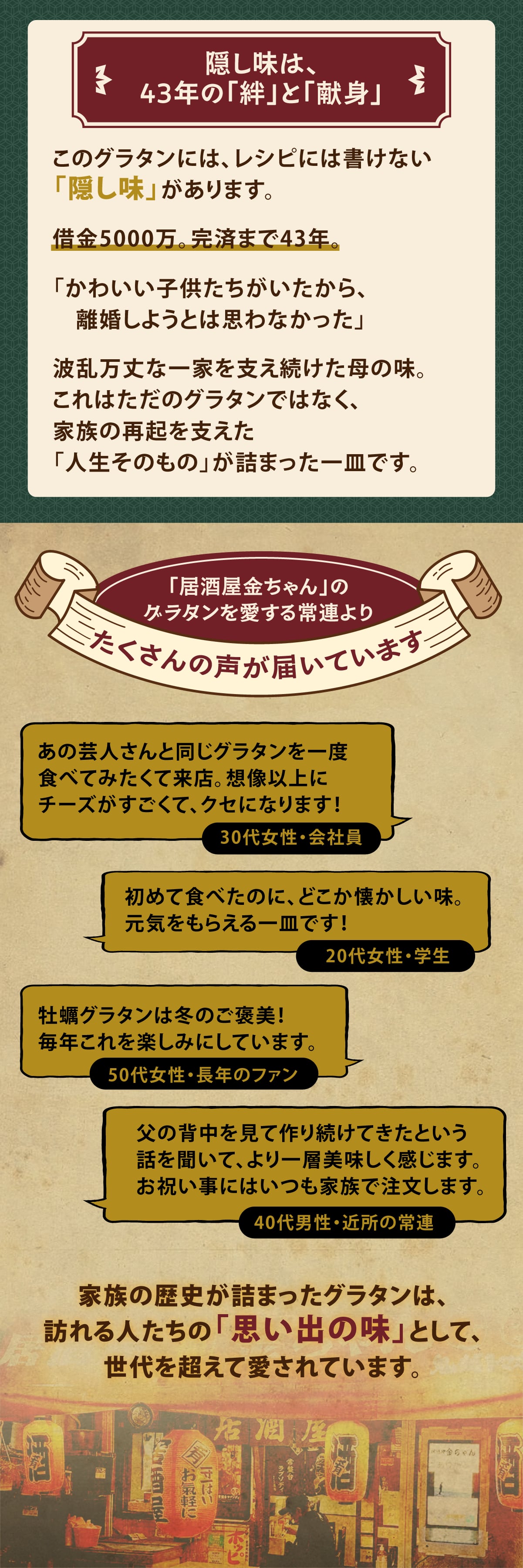 居酒屋金ちゃんの看板メニューであるグラタンをもとに、店主のレシピを再現して作っています。